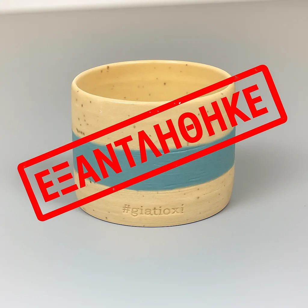 Αυτή η κεραμική κούπα, κατασκευασμένη από ανθεκτικό πηλό, καθιστώντας το ιδανικό για ποικίλες χρήσεις, όπως η απόλαυση καφέ, παγωτού ή ακόμα και affogato. Έχει ένα φυσικό, γήινο βασικό χρώμα, με μια εντυπωσιακή μπλε λωρίδα που περιβάλλει τη μέση, δίνοντάς του μια μοντέρνα και κομψή εμφάνιση. Η υφή είναι διακριτικά διάστικτη, προσθέτοντας μια ρουστίκ γοητεία. Το κάτω μέρος της κούπας δεν έχει γυάλισμα, αναδεικνύοντας τη φυσική υφή του πηλού και είναι χαραγμένο με το hashtag “#giatioxi”, προσθέτοντας μια μοναδική, προσωπική πινελιά.